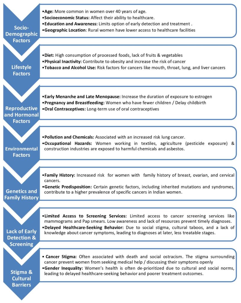 The prevalence of cancer among Indian women is influenced by a combination of socio- demographic, lifestyle, reproductive, environmental, and cultural factors (depicted in Fig.1). To address the rising burden of cancer, it is crucial to identify these factors and address them through comprehensive strategies that can help improve early detection, treatment, and outcomes for women with cancer in India.